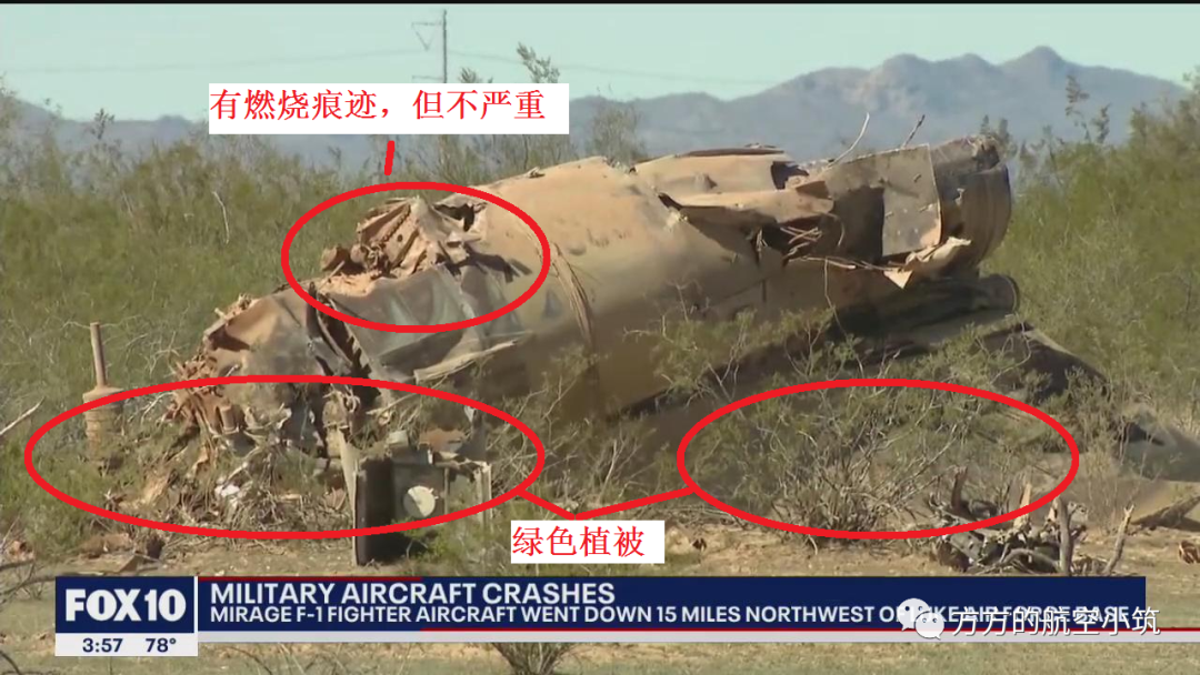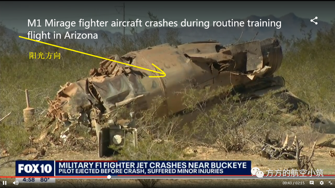 再考虑到卢克基地的纬度(参照凤凰城)为35°24'00.00"N,那么此时的阳光方向大致应该是西西南——东东北方向。注意照片中残骸的机头指向是逆光的(残骸有翻滚,但不至于倒转180度),所以大致可以推测663的航向为东东北——西西南方向。