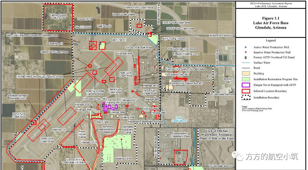 按媒体描述在卢克空军基地西北24公里左右的无人区。下面是卢克空军基地示意图,可以看到跑道为东北-西南方向。