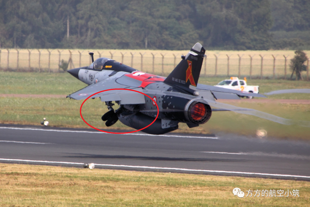 上图这个主起落架残骸的状态,只能是已经放下来了。因为幻影F.1的主起落架设计比较有特点,收起来的时候是在垂直面上向上翻转180度收入主轮舱。如下图。