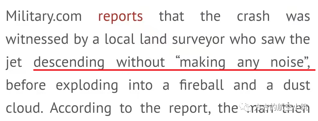 记者采访当地一个目击者的时候,有一句很关键的话“没有任何声音”。在其它描述中,可以看到目击者距离坠机点只有2000英尺左右,不可能听不到发动机的啸音,所以如果目击者证词无误的话,那就只有一个解释:发动机停车。