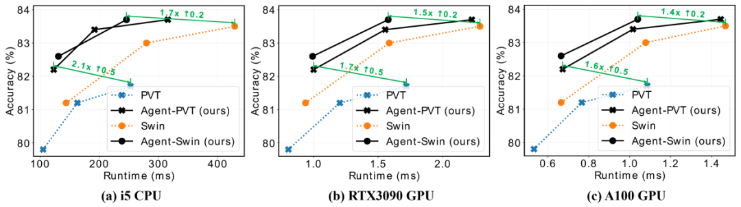 在实际推理速度方面,代理注意力也具有显著的优势。如下图所示,在 CPU/GPU 端,代理注意力模型能够取得 2.0 倍 / 1.6 倍左右的加速,同时取得更好的性能。