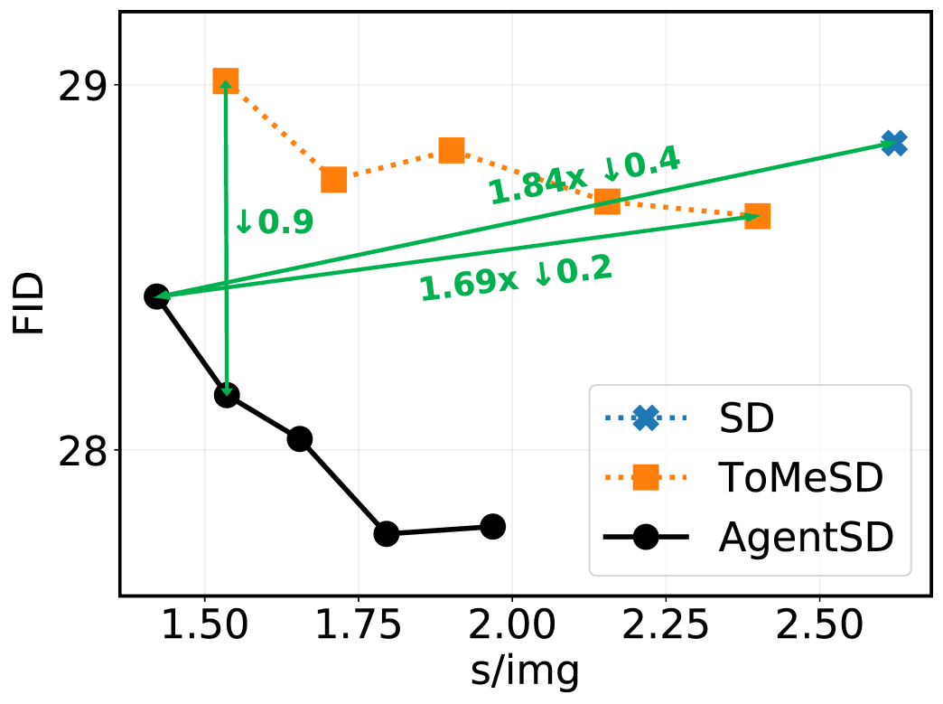 3. 创新性地以一种无需训练的方式将代理注意力应用于 Stable Diffusion 模型,显著提升生成速度并提高图片质量,为扩散模型的加速和优化提供了有效的新研究思路。