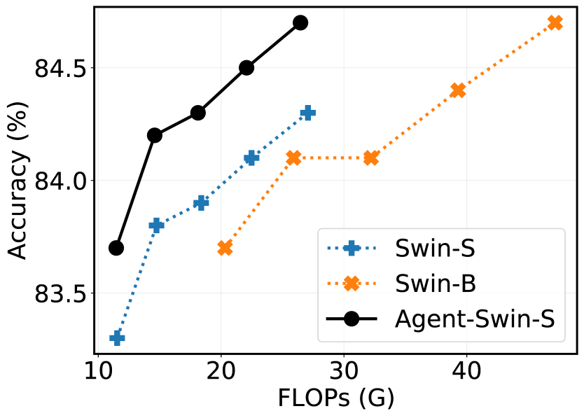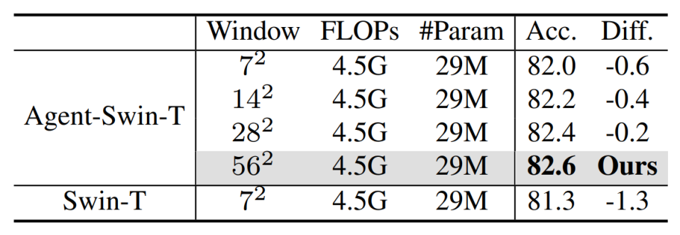 2. 能够采用更大的感受野。得益于线性计算复杂度,代理注意力可以自然地采用更大的感受野,而不会增加模型计算量。例如,可以将 Swin Transformer 的 window size 由 7^2 扩大为 56^2,即直接采用全局自注意力,而完全不引入额外计算量。