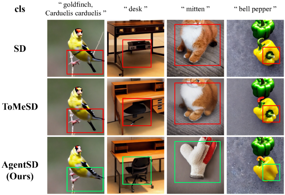 特别值得指出的是,代理注意力可以直接应用于 Stable Diffusion 模型,无需训练,即可加速生成并显著提升图片生成质量。如下图所示,将代理注意力应用于 Stable Diffusion 模型,能够将图片生成速度提升约 1.8 倍,同时提升图片的生成质量。
