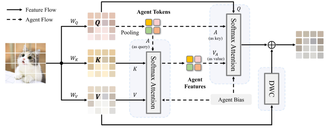 具体来说,代理注意力在传统的注意力三元组 (Q,K,V) 中引入了一组额外的代理向量 A,定义了一种新的四元注意力机制 (Q, A, K, V)。其中,代理向量 A 首先作为查询向量 Q 的代理,从 K 和 V 中聚合信息,然后将信息广播回 Q。由于代理向量的数量可以设计得比查询向量的数量小得多,代理注意力能够以很低的计算成本实现全局信息的建模。