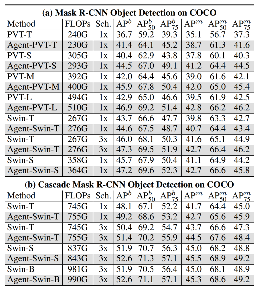 2. 在分类、检测、分割等诸多任务中充分验证了代理注意力的优越性,特别是在高分辨率、长序列的场景下,这或为开发大尺度、细粒度、面向实际应用场景的视觉、语言大模型提供了新的方法。