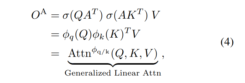 上图即为代理注意力的示意图,下面给出具体数学形式。为了书写方便,我们将 Softmax 注意力和线性注意力分别缩写为: