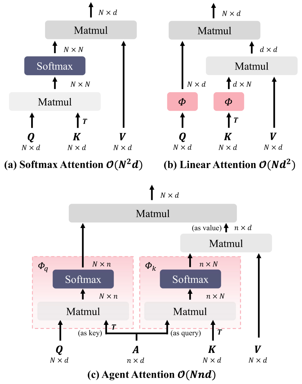 在本文中,我们创新性地向注意力三元组 (Q,K,V) 引入了一组额外的代理向量 A,定义了一种四元的代理注意力范式 (Q, A, K, V)。如图 1 (c) 所示,在代理注意力中,我们不会直接计算 Q 和 K 之间两两的相似度,而是使用少量的代理向量 A 来收集 K 和 V 中的信息,进而呈递给 Q,以很低的计算成本实现全局信息的建模。