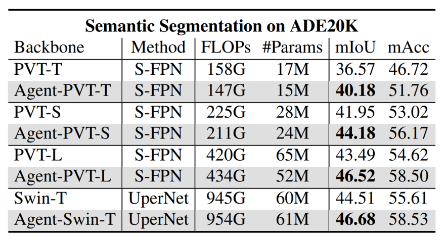 代理注意力是一个通用的注意力模块,本文基于 DeiT、PVT、Swin Transformer、CSwin Transformer 等模型架构进行了实验。如下图所示,在 ImageNet 分类任务中,基于代理注意力构建的模型能够取得显著的性能提升。例如,Agent-Swin-S 可以取得超越 Swin-B 的性能,而其参数量和计算量不到后者的 60%。