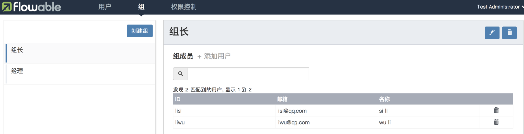 利用相同的方式,我再创建一个组长的组,并为之添加两个用户 lisi 和 liwu。