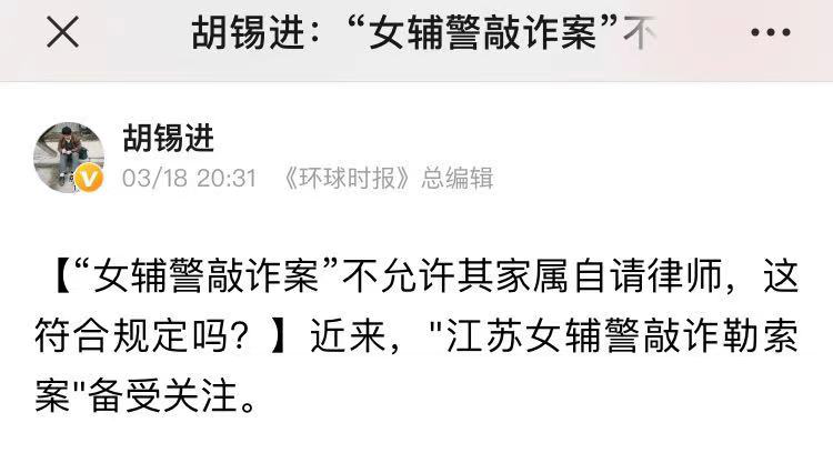 上周五,我写了一篇关于女辅警的文章。在发出后3个小时即告失联。而与此同时,某球时报的胡总编也发表了一篇同类文章。引述的新闻事件内容与我的文章相同。区别在于其“叼功”强悍。在网上大多数同类题材文章纷纷升天,连许女士家属的微博也不能幸免的情况下。唯有胡总编的大作依旧坚挺于网络。这要是不给个州官的位置坐坐,还真是屈才了。