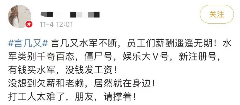 如果此轮的讨薪潮持续发酵,各地的地产物业、供应商严加催逼,言几又将面临成立以来最严峻的考验。或许这也能回答网友质疑:为什么言几又这几天一边忙着删帖,一边发动营销号、水军在微博营造“岁月静好”假象。