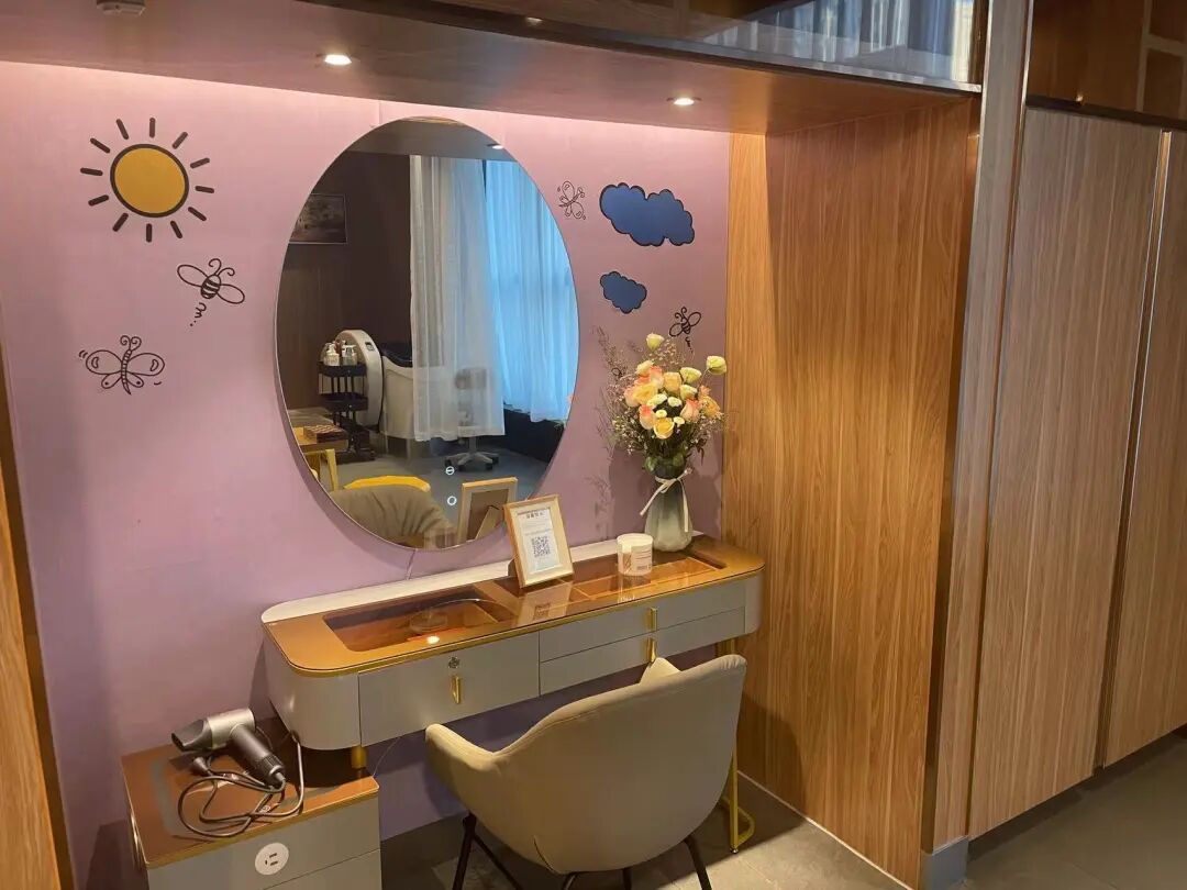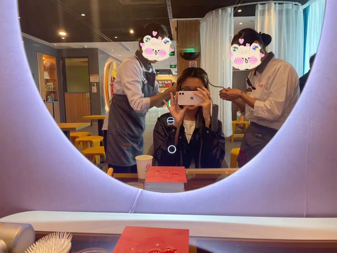 门店提供了滋养保湿、修复受损等数瓶不同功能的洗发水供顾客自由选择,大多是市面上常见的牌子,用网友的话说,“虽然不如大牌,但是也比街头小店里那种杂牌大桶洗发水好多了”。实在用不惯店里提供的,顾客还可以选择自带洗护产品上门洗头——就像天津人吃煎饼果子会自带俩鸡蛋一样自然。上午11点刚过,我成了这一天第一位洗头的顾客。虽然同为海底捞的增值服务,但与美甲相比,洗头的门槛更高。预约美甲或手部护理只需在店里用餐(甚至不吃饭也可以直接扫码排号,店员一般不会戳穿),但洗头的权益只能用捞币兑换。北京这家店洗一次头500捞币,相当于曾在海底捞消费过500元,比此前无锡那家海底捞贵了300捞币,店长说这是因为地域不同,“北京可是一线城市”。捞币一般消费后隔天到账,这就意味着只能消耗过去积攒的,哪怕当天在海底捞消费了500块,也得隔天才能洗上头。给我洗头发的是店员赵白,前一天从中午开始“上人”,她几乎一刻不停地洗到晚上十点下班,一共才洗了十多个人。第二天一早,店长刘婷特地过来嘱咐她,一天最多排30个人,“多了得洗到后半夜”。等到第二天,人明显少了很多,从开业到傍晚五点,赵白总共只服务了八个顾客。下午没什么人就餐,她闲着就只能摆摆椅子,擦擦桌子,“估计肯定不会到30个人了”。与美发店不同,顾客走出店时不是精致“换头”,倒像是刚出了洗澡堂子,热气腾腾的。赵白发现,前来洗头的顾客几乎都是女性,一般当天没化妆,或许是担心洗发会弄脏妆面,头发也总是因为出了油拿头绳绑着。服务指南上写着,洗发后店员会提供吹干和编发服务(一般给儿童),不过,镜子前的桌子目前还是光秃秃的,没有配备精油等护发产品,因此,还不能做什么造型,只能简单吹干。惯常的一幕是,顾客在店里吃完火锅,顶着满头牛油味儿躺下,洗完吹干后顶着一头蓬松离开。不少网友对此很心动,“哪天不想自己在家洗头了,就去吃一顿火锅”。▲洗完头发后,店员在梳妆镜前帮顾客吹干头发。图 / 每日人物