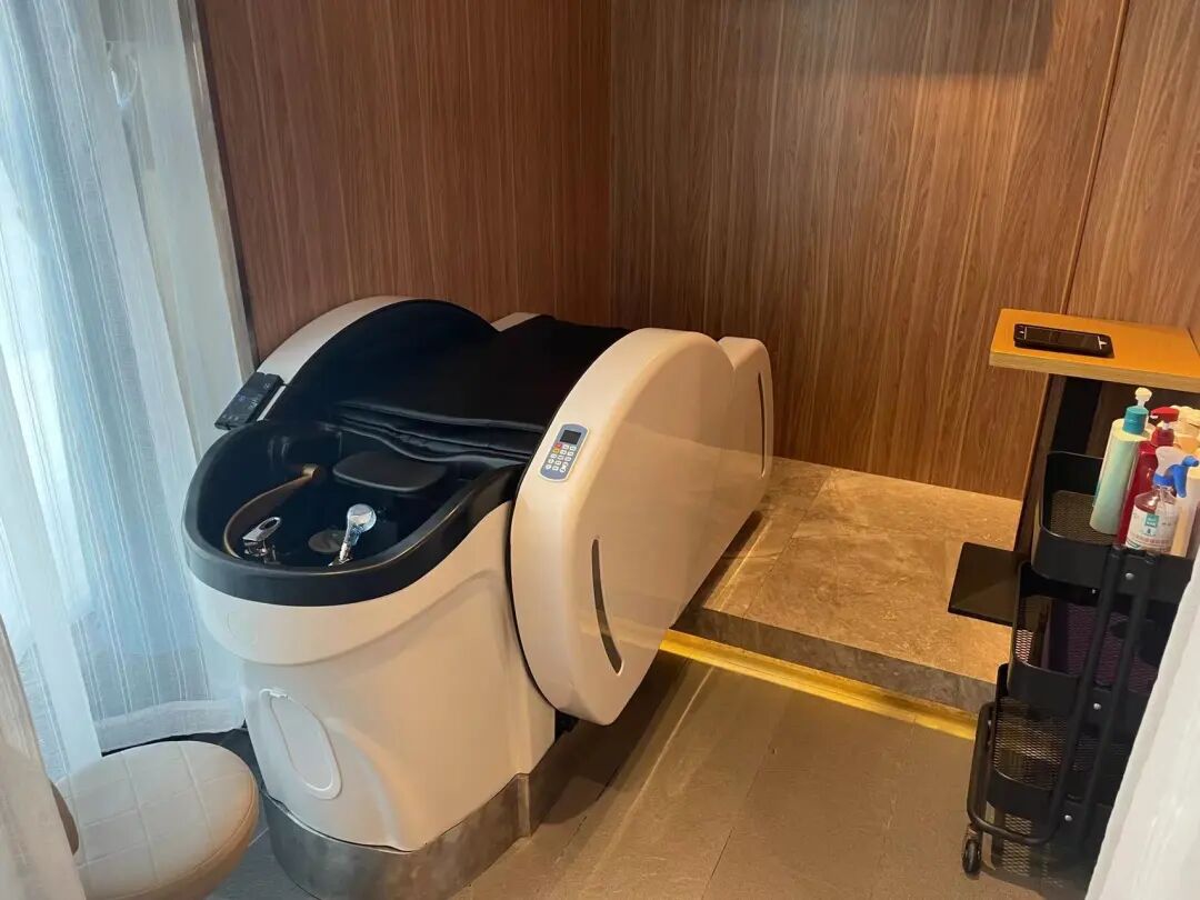 海底捞火锅已将“增值服务”从美甲、手部护理、擦鞋,进一步拓展到了洗头。10月13日上午,一踏入北京市万丰桥的海底捞,就能感受到空气中强烈对冲的两种味道——一边是麻辣鲜香的火锅味,另一边是果香甜腻的洗发水味。这是目前北京唯一一家试点洗头服务的海底捞,上线第二天,我们寻思着,去洗个头体验一下。事实上,不止气味,整个洗头发的流程都无限接近美发店。在正门的旁边,这家海底捞开辟了一个纱帘挡住的小房间,刚好容下一张按摩洗发椅,可以一边按摩一边洗头。▲店里新添置的洗头按摩椅,专门放置在门店一角的一片纱帘背后。图 / 每日人物