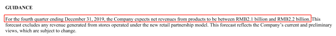 瑞幸预计2019第四季度产品净收入在21亿到22亿之间(截图来源:瑞幸财报)