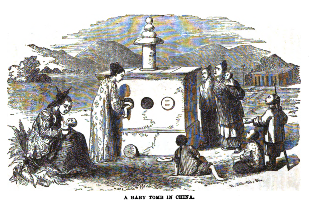 “上海婴儿塔”,约翰·斯卡思(John Scarth)《在中国的十二年》(Twelve Years in China,1860)泰勒的记述是首批向西方读者展现婴儿塔的长篇文学作品之一。近一个世纪以来,中国的观察家们经常感到有必要就儿童的下葬方式发表评论。其中一些人甚至从未见过这些建筑,却从不试图掩饰他们对这些婴儿塔的反感,他们认为这是恶臭的杀戮之地。1858年,乔治·库克(George W. Cooke)的报告为随后许多报告奠定了基调。在与英国副领事弗雷德里克·哈维(Frederick Harvey)访问上海期间,库克回忆了以下对话:这位精力充沛的副领事没有被吓倒,他有时充当向导、哲学家和朋友,并与我一起讨论这里错综复杂的情况。我想知道为什么中国人不把它切成块,用作肥料。在离那座塔还有五码远的地方,他使劲地吹着他的方头雪茄,说道:“这就是婴儿塔。”“婴儿塔。透过石雕上的缝隙往里看——不要靠太近,否则散发的臭气可能会要了你的命。你会看到一堆席子。似乎有东西在动,但那只是蠕虫在爬行。有时,稻草里露出一条细小的腿或胳膊,或者一小块没有肉的骨头。这座塔现在不像我之前看到时那么满了。他们最近一定把这里清空了。”“中国人说这只是一座坟墓。棺材贵,农民穷。孩子死了,父母就用竹席把他们包起来,扔到里面去,就这样就行了。塔里塞满之后,有关当局就把那堆东西烧掉,把灰烬撒在地上。”没有调查,没有检查。父母能杀人,也能救人。大自然在中国母亲的心中说话,就像在英国母亲的心中说话一样,但是匮乏和耻辱的喊声在这里更大些。——《泰晤士报》驻中国特派记者乔治·库克(1857年至1858年)![]()