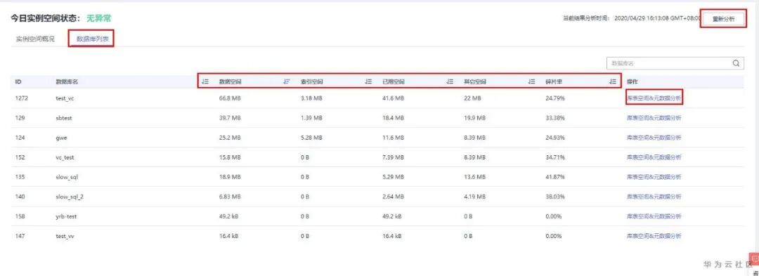4、数据库列表页签,可以查看数据库名、数据空间、索引空间、已用空间、其它空间、碎片率等信息,可以根据需要进行排序,按照数据库名进行查询,执行库表空间&元数据分析操作: