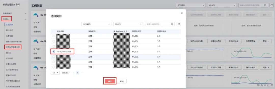 2、左侧菜单 云DBA-->空间&元数据分析,并选择要分析的RDS实例: