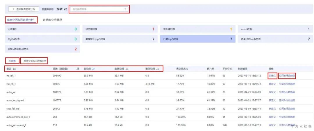 1)库表空间&元数据分析页签,可以查看表库表空间&元数据分析的总体结果、详细结果、以及所有表的列表信息、查看表定义信息和空间&行数趋势信息,“选择数据库”可以方便切换所需要的数据库;