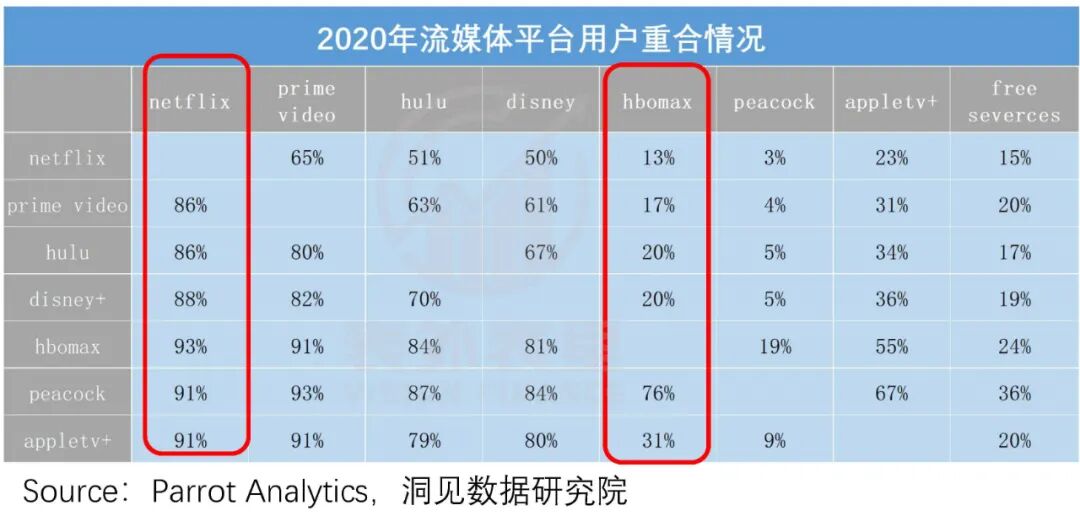 比如,2020年用户在订阅其他平台之后,选择奈飞作为第二平台的平均概率为89%,选择HBO平台的平均概率为29.5%。