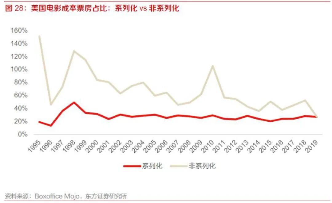 比如,1995-2019年(收录于Boxoffice)美国电影的数据表现显示,系列化电影成本控制非常稳定,维持在27%左右;而非系列化电影成本票房比波动巨大,平均在67%左右。