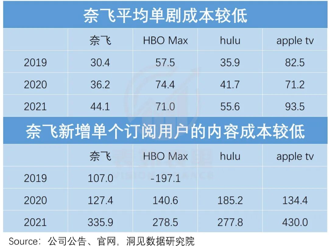 就数据来看,2019-2021年,奈飞的单部剧集内容支出,一直远低于HBO,甚至比侧重于腰尾内容的hulu还要低。