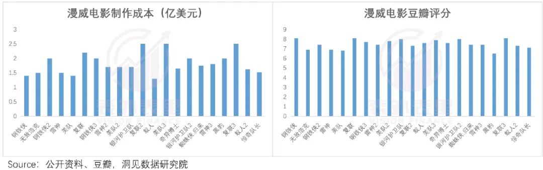 举例来说,漫威从2008年系列第一部开始,流水线批量生产下,平均每年有2-3部影片上映,且标准化下,影片质量保持在一定的水准之上。如下图,其20部影片中,82%的影片豆瓣评分都在7分以上。