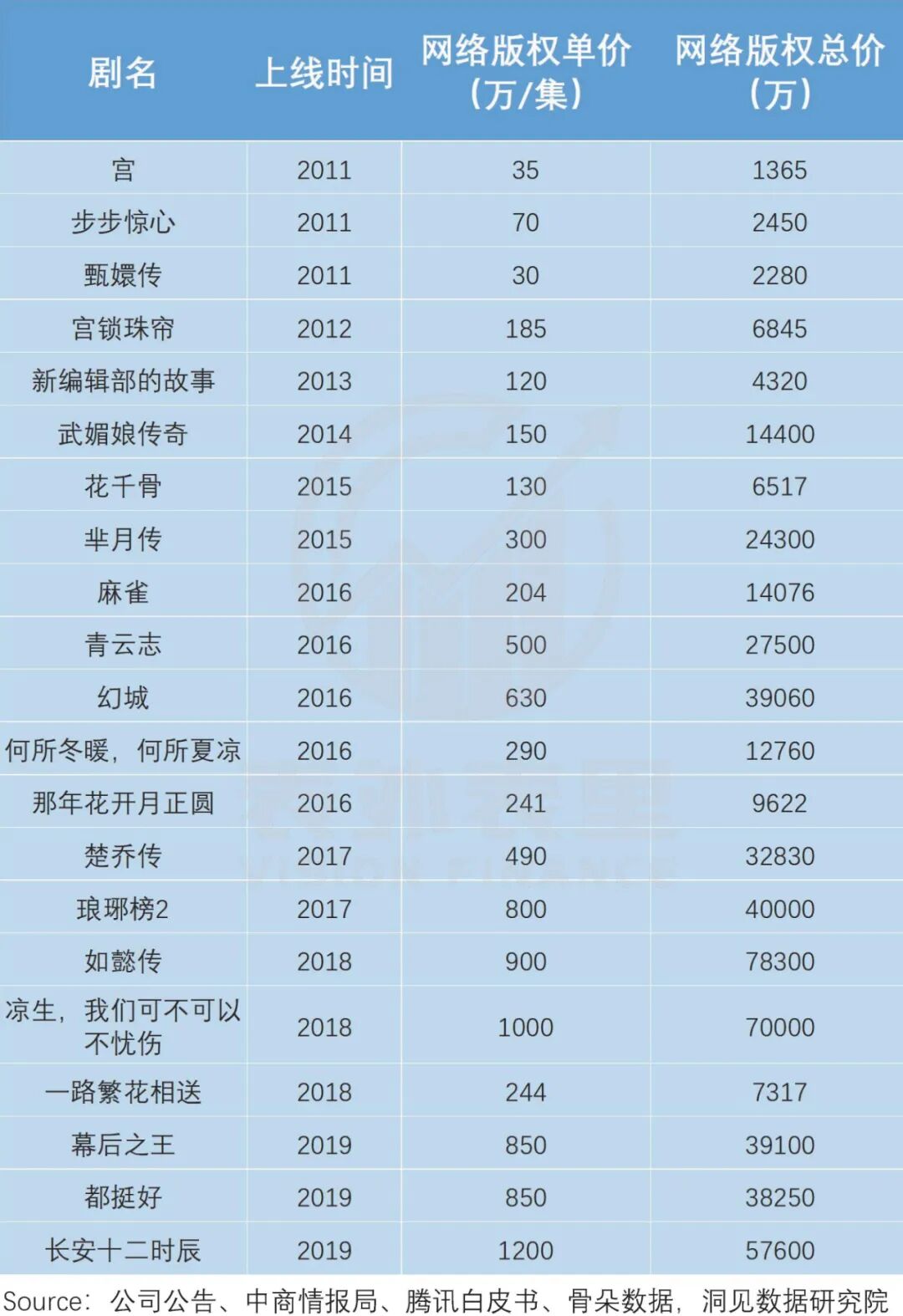 如下图,头部剧集《如懿传》、《幻城》等,同样是大制作投入——比如,腾讯购买《如懿传》版权花费了7.8亿,但这些剧集每元钱获取的播放量都在100以下,甚至《如懿传》为个位数,显然无法覆盖制作投入。