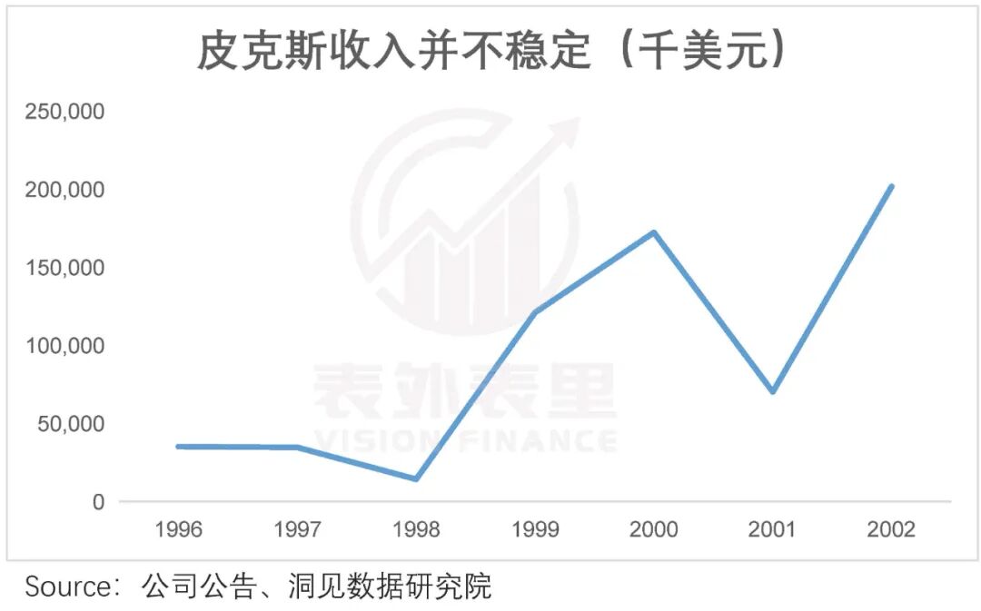 这导致其收入结构很不稳定。如下图,1996-1998年年底前,以及1999-2001年底前,皮克斯都一部作品也没有产出,使得1998、2001年的收入出现大幅下滑。