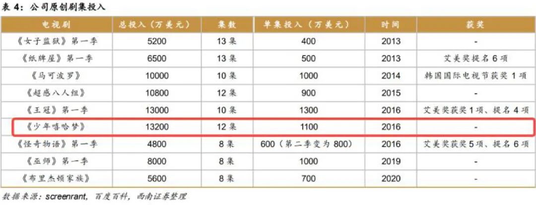 比如,2016年,奈飞《少年嘻哈梦》第一季,总投入1.3亿美元,但由于题材小众,收视不及预期,损失惨重,不过这未对公司正常经营产生影响。