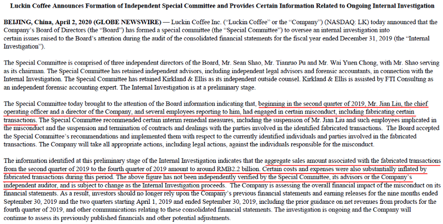 在本该公布财报的时间段里,4月2日盘前,瑞幸自己公布了一份6K重大事件公告——公告自曝瑞幸在进行2019年年度审计期间发现相关业务数据存在问题,因此董事会成立一个特别委员会对相关问题进行内部调查,并发现公司内部来自神州系的COO刘剑以及某位董事确实存在业务数据造假行为。