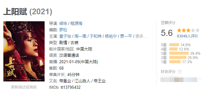 对于这一批观众来说,演员的颜值和演技能否营造出氛围感,满足观众的代入和想象,这才是选角最重要的因素。在这一点上失算的《上阳赋》,即使在全员演技在线的情况下,仍以豆瓣5.6分收场。