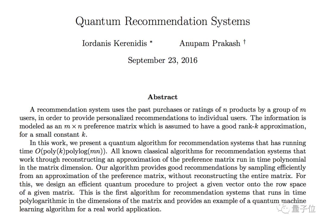 直到2016年,一篇论文:Quantum Recommendation Systems,也就是量子推荐系统,终于在一个大众关心的问题上,证明了量子计算的优越性。