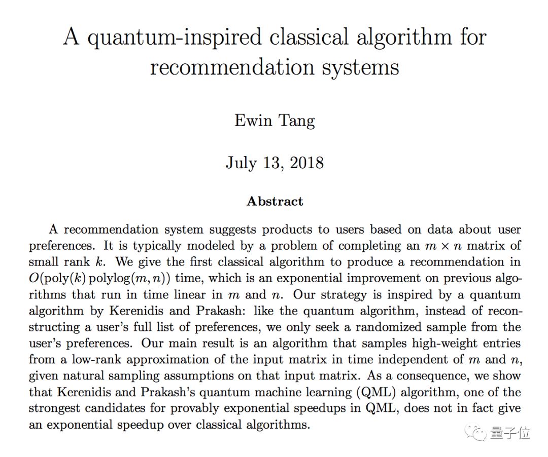 不好意思,这件事的最佳证据:量子推荐系统,已被华盛顿大学准博士生Ewin Tang“杀死”。