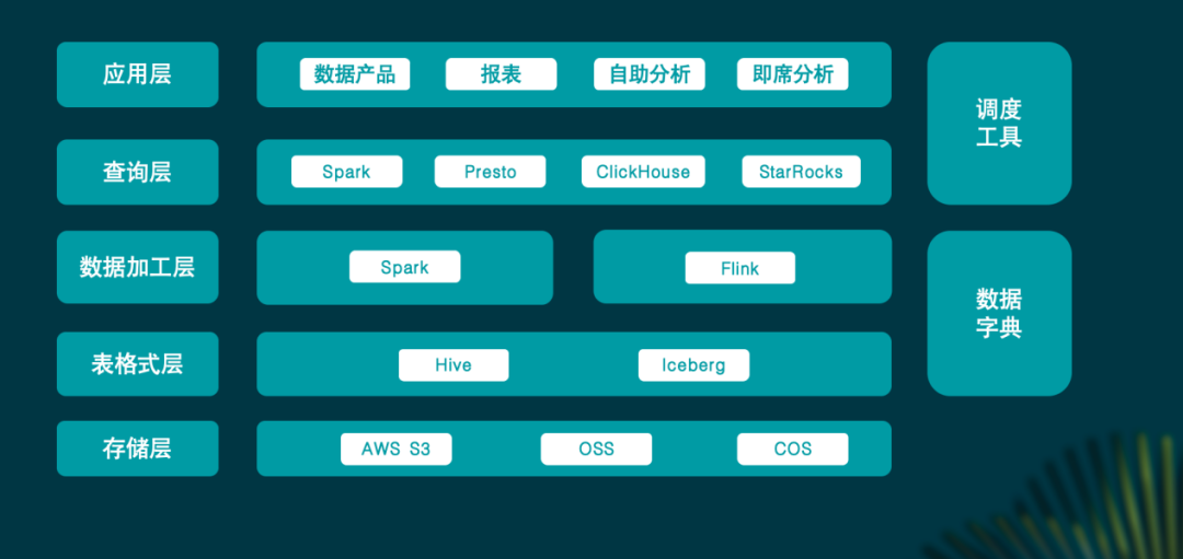 图中是小红书数据平台的整体架构,从下往上分别为存储层、表格式层、数据加工层、查询层、应用层。