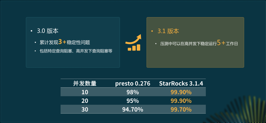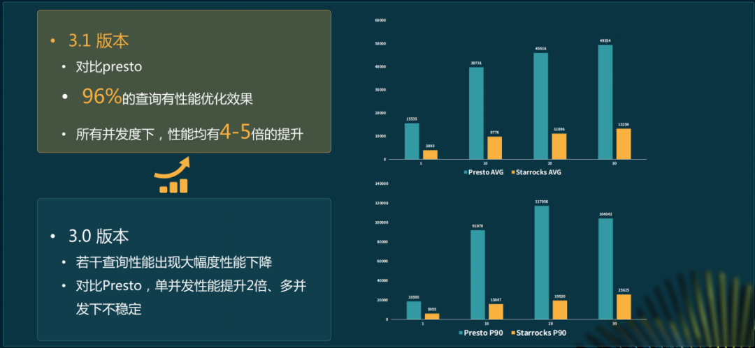 StarRocks 3.0 提出了湖仓分析新范式,在湖上分析能力的增强,给我们带来了曙光。根据官方的一个 benchmark,相比于 Trino, StarRocks 直接分析湖仓数据能够有 3~5 倍的性能提升,因此我们决定从 Presto 迁移到 StarRocks 上。