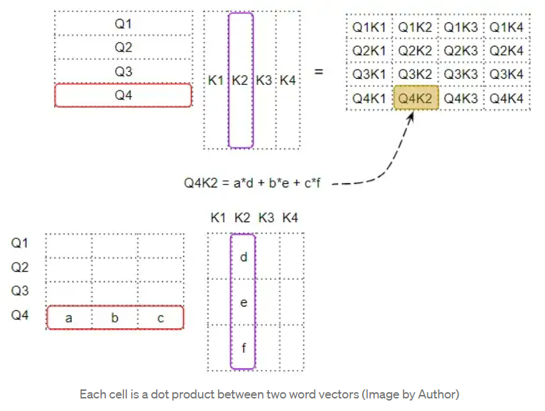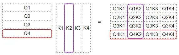 为了理解这一点,请记住,Query, Key, Value 行实际上是具有嵌入维度的向量。让我们放大看看这些向量之间的矩阵乘法是如何计算的:
