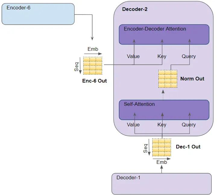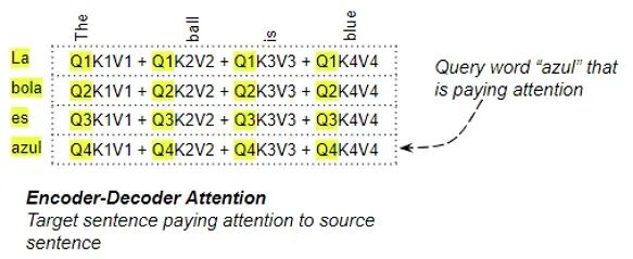 在 "Encoder-Decoder Attention "中,Query 来自目标句,而Key/Value来自源句。这样,它就能计算出目标句中每个词与源句中每个词的相关性。