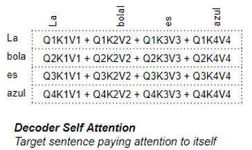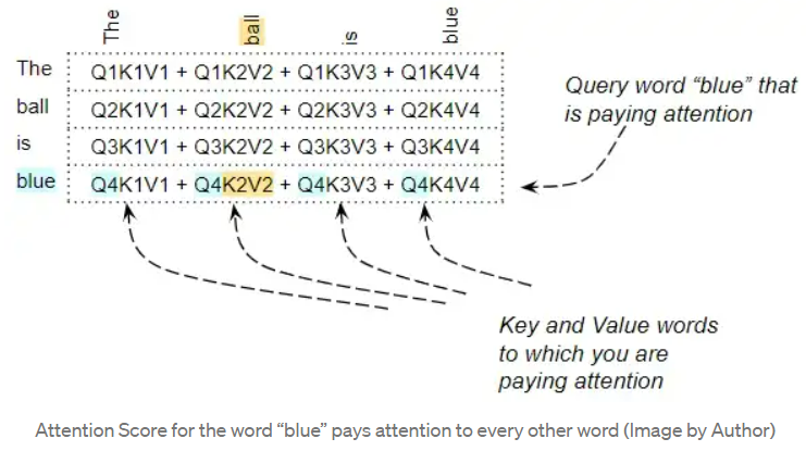 例如,对于 "The ball is blue "这个句子,单词 "blue "这一行包含 "blue "与其他每个单词的注意力分数。在这里,"blue "是 Query word,其他的词是 "Key/Value"。