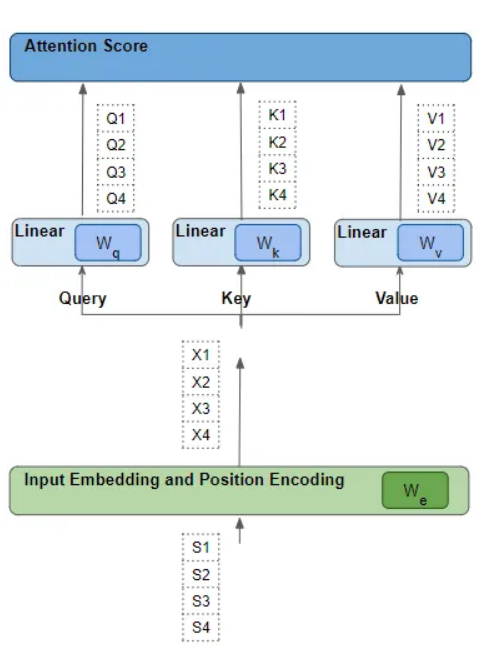 Attention module 中,嵌入的序列通过三个线性层(Linear layers),产生三个独立的矩阵--Query、Key、Value。这三个矩阵被用来计算注意力得分。这些矩阵的每一 "行 "对应于源序列中的一个词。