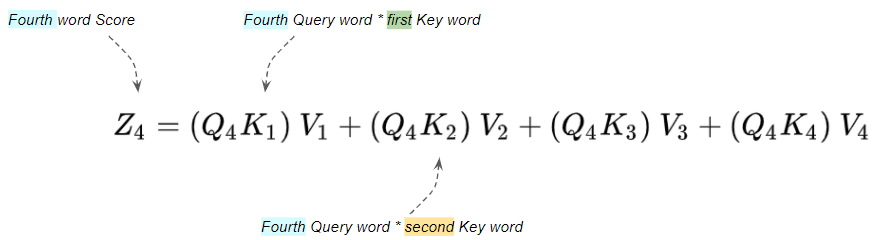 因子矩阵再和 V 矩阵之间进行矩阵相乘,产生注意力分数(Attention Score)。可以看到,输出矩阵中第 4 行对应的是 Q4 矩阵与所有其他对应的 K 和 V 相乘: