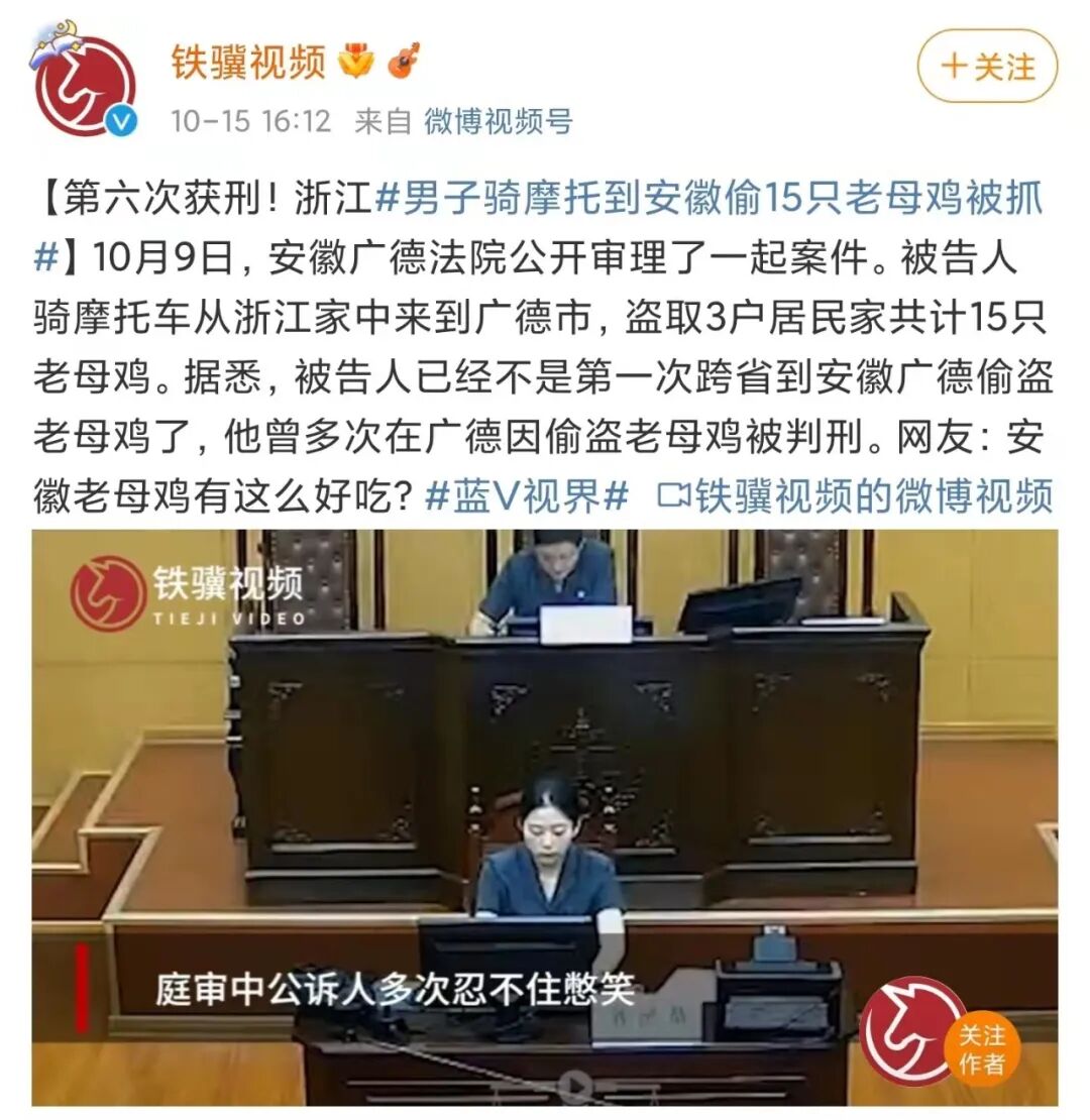 本来跨省偷鸡这事就够搞笑了,更奇葩的是,经法官披露,被告人已经不是第一次跨省到安徽广德偷盗老母鸡了,从1996年到2021年,被告人一共有6次盗窃案底。