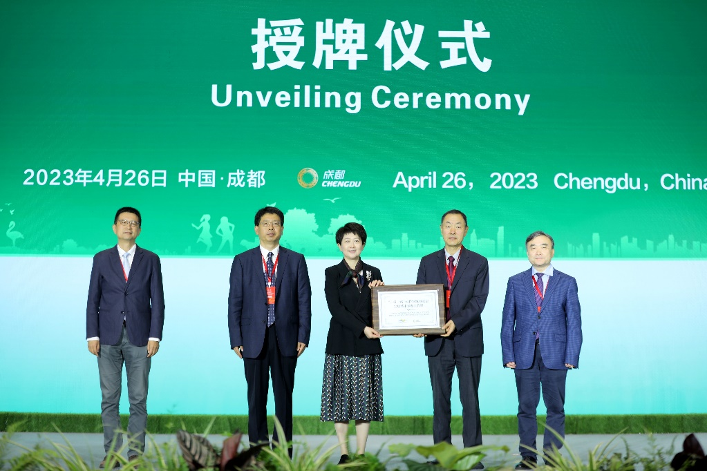 (联合国人居署中国项目主任张振山(右二)为“一带一路”可持续城市联盟宜居城市专题工作组授牌,中共成都市委常委、成都市常务副市长刘筱柳(中)揭牌。中国城市和小城镇改革发展中心主任高国力(左二)、能源基金会首席执行官兼中国区总裁邹骥、世界卫生组织驻华代表处国家项目官员姜晓朋见证授牌)