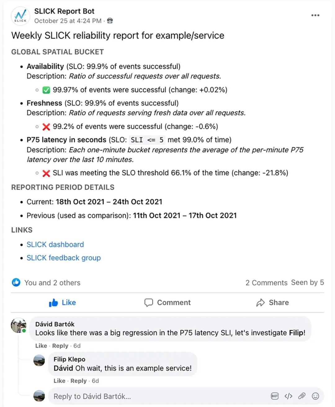 SLICK为工程师提供了SLO性能总结报告的能力,这些报告会定期发布给内部团队。报告为服务开发团队提供了一种简单的方法来关注回归并进行回顾,我们经常看到服务开发团队在这些帖子的评论中讨论可靠性问题。
