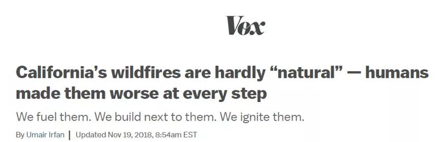 如美媒Vox所言:“我们提供了山火燃料,我们在山火附近修建房子,我们点燃了山火”