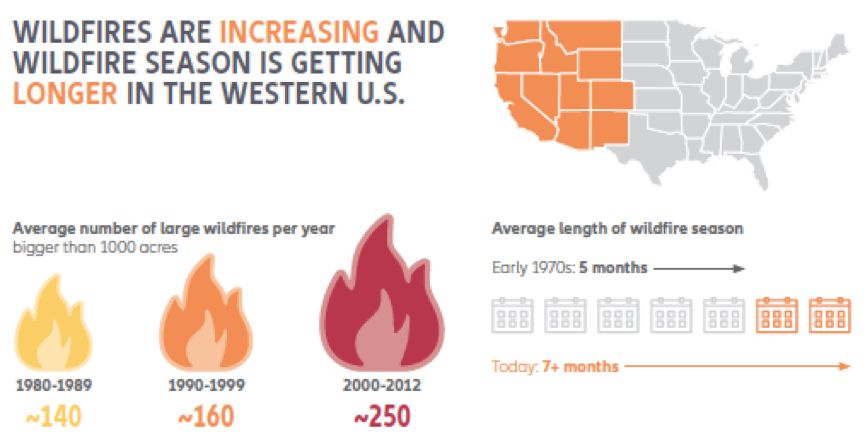 加州山火由来已久,有记录的自1930s始,每年大大小小山林野火上千起,且规模和破坏力不断扩大。据统计,从1980年到2012年,美国西部地区覆盖面积超1000公顷的山火数量从每年140起增至250起,而山火季的长度也从70年代的5个月变为7个月。