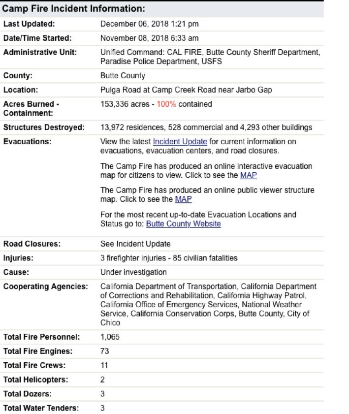 坎普山火详情,来源:加利福尼亚州森林及防火局(CAL Fire)