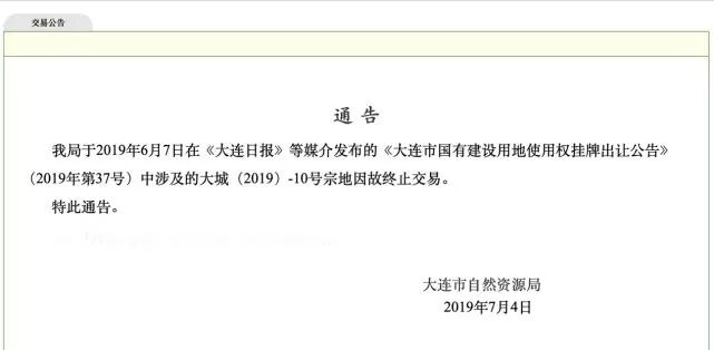 7月4日下午,大连市自然资源局通告显示,“我局于2019年6月7日在《大连日报》等媒介发布的《大连市国有建设用地使用权挂牌出让公告》(2019年第37号)中涉及的大城(2019)-10号宗地因故终止交易”。