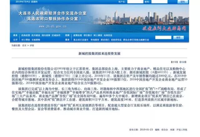 大连招商网2019年1月份的信息显示,“新城控股集团拟来大连投资发展,该集团拟在大连投资建设吾悦广场和“悦”系列五星级酒店等项目,打造新的城市地标”。