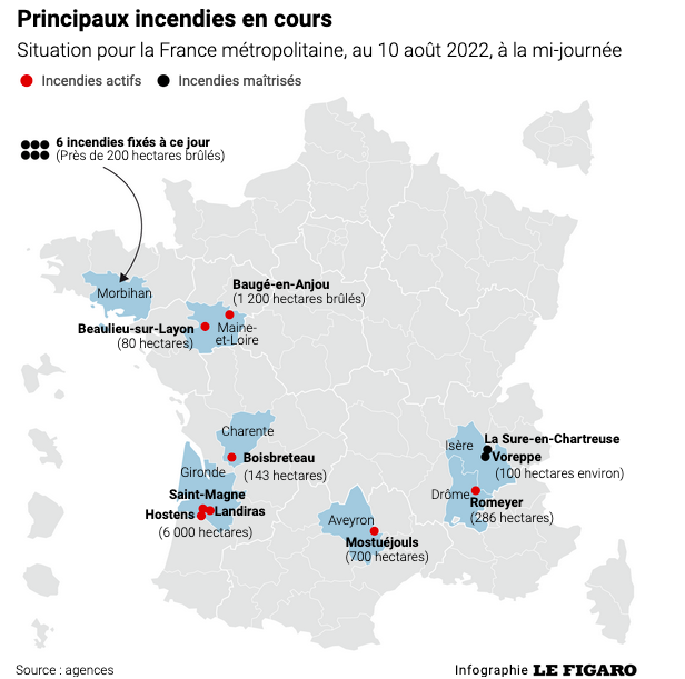 并不是每场火都控制住了,所以燃烧面积还在扩大。至少,到8月10日统计时,吉伦特省的火烧毁的面积比其它六场火波及面积总和的2倍还多;而且,这个6000公顷不过是烧了大半天而已——实为“火王”啊!